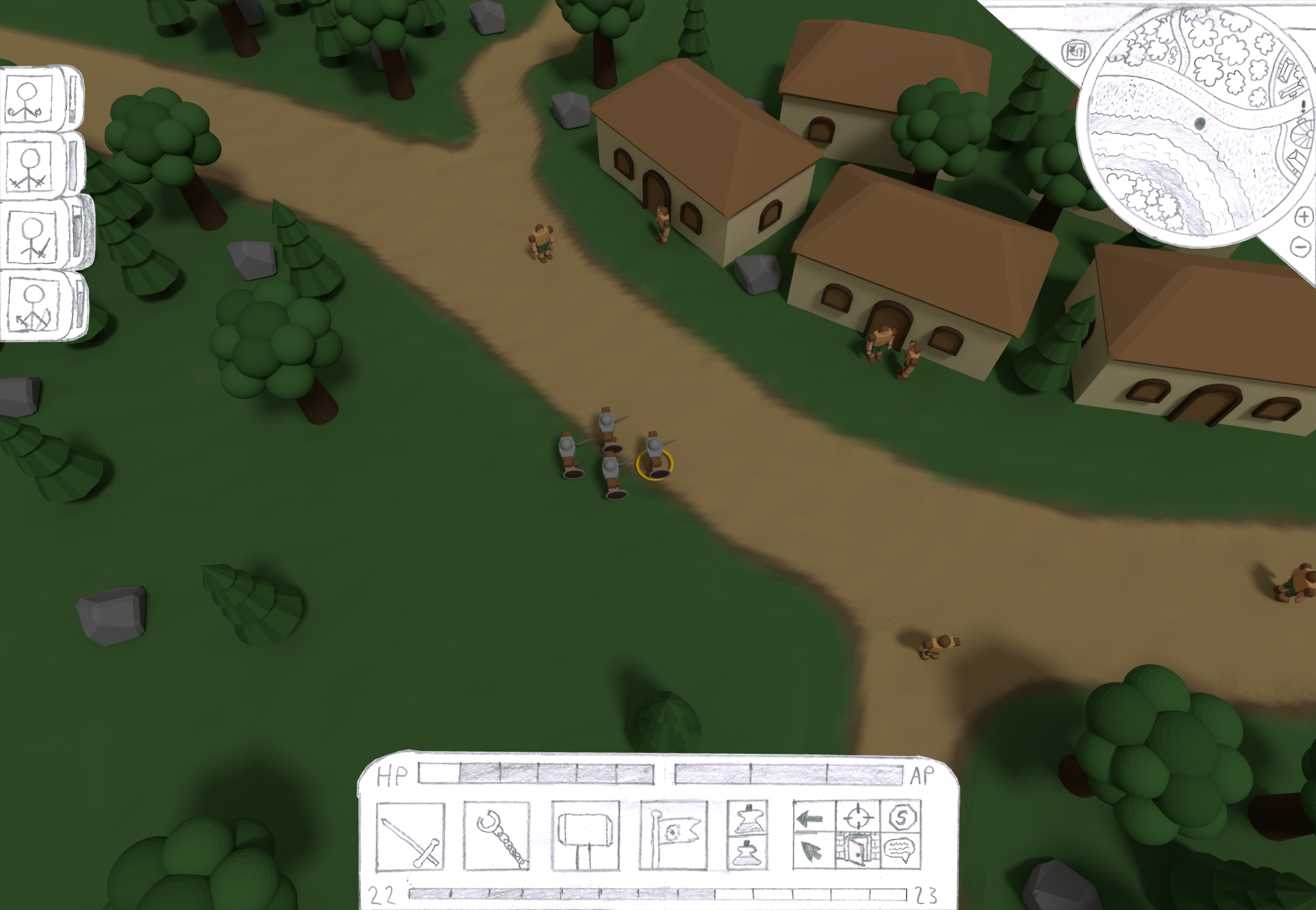 The player must move their characters around the world, interacting with the games inhabitants to obtain quests. Each character has a limited health, mana and a set of abilities to use in battle. Combat takes a turn-based approach where the player and enemy each take goes to move their characters and cast abilities on their foes. If a characters health drops to zero they permanently die, if all the player’s heroes die then the game is over.