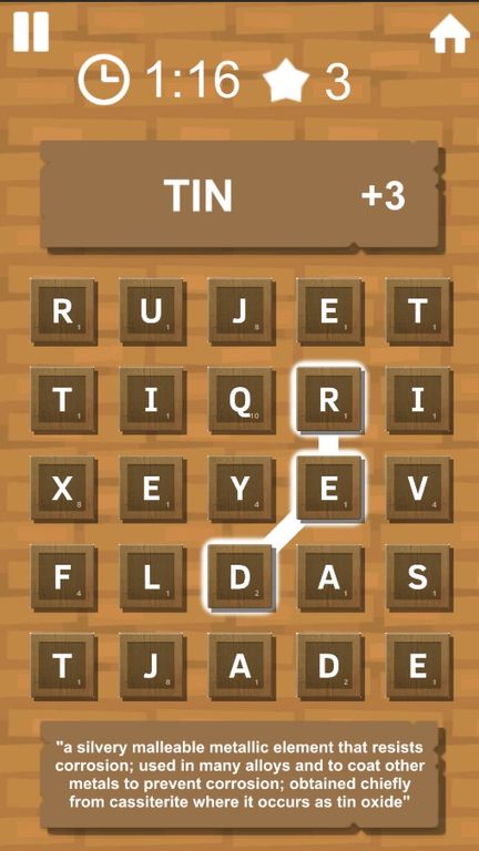 When the player completes a word, as well as awarding them a well earned points increase the game also serves up that words definition, this allows for the players to learn more about words they thought they knew, or potentially learn about words they never knew to start with.