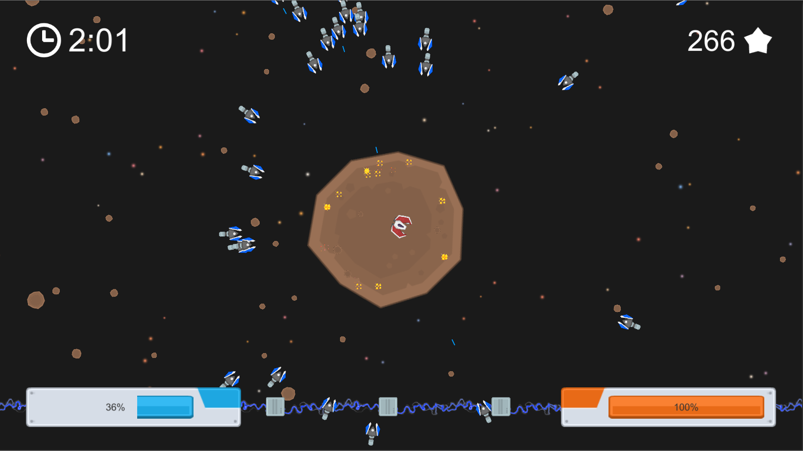 Waves are every increasing in number with your score being just how long you can survive the onslaught. The aim of the game is to survive as long as possible, as the time progresses the number of enemies continues to increase until the player is overwhelmed.