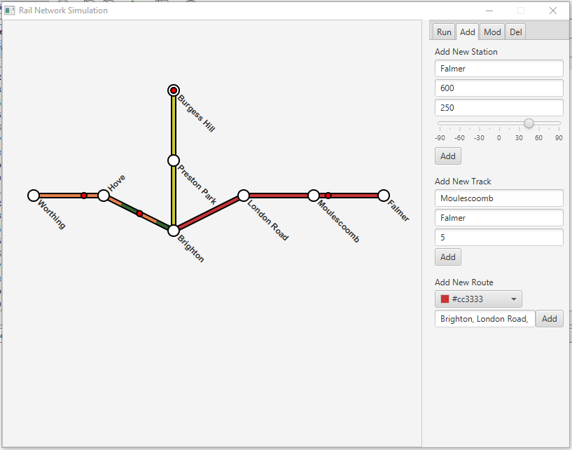 Rail network simulator is a tool designed to mimic the iconic style and layout of the London Underground tube map. The user is able to add stations or stops to the map and then connect those using tracks. FInally you specify which stations are on a trains routes and how go.
